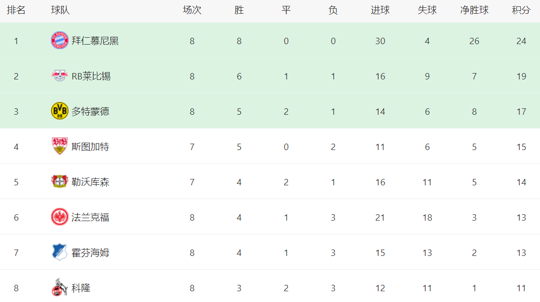 在积分榜上,拜仁以24分独占鳌头,领跑德甲。莱比锡紧随其后,以6胜1平1负的战绩拿到19分,仅比拜仁少5分。多特蒙德则以5胜2平1负的战绩积17分,位列第三。斯图加特以15分排名第四,勒沃库森则以14分排名第五,本赛季很难对拜仁的榜首位置构成威胁。法兰克福和霍芬海姆则同积13分,位列积分榜中游。