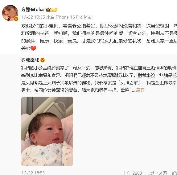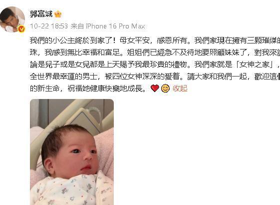孩子出生后,郭富城更是迫不及待地在社交平台晒幸福:“我们的小公主终于到家了!母女平安,感恩所有。我们家现在拥有三颗璀璨的明珠,我感到无比幸福和富足。”