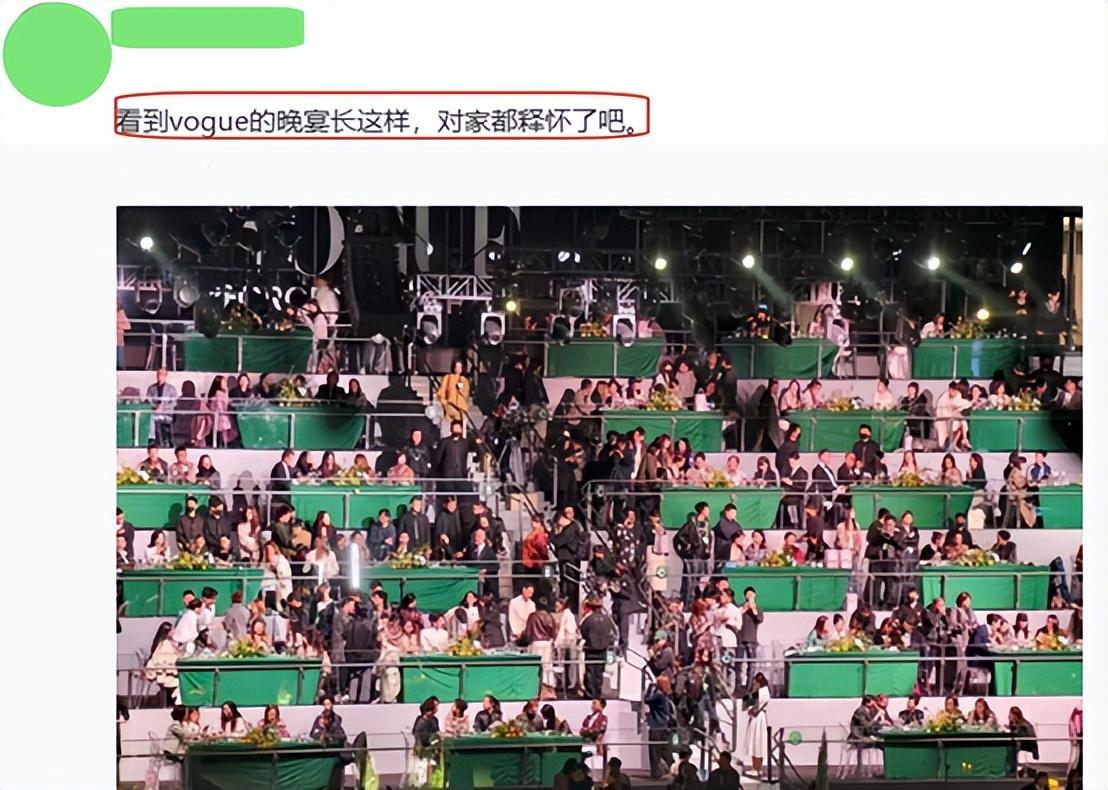 晚宴现场,阶梯状座位搭配绿色桌布与简陋桌椅,被网友调侃为“草台班子”。有网友辣评:“看到VOGUE晚宴长这样,对家都释怀了。”