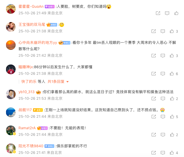 不仅是法比奥,北京球迷面对俱乐部糟糕的表现也彻底怒了。赛后国安官微发布的本场战报下面,再次被球迷的愤怒评论所“爆破”。球迷们纷纷留言表达对球队的不满和失望。