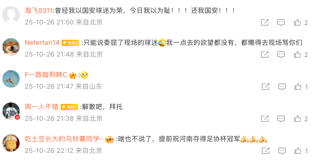 不少球迷直言国安脸都不要了:“毫无意外,大周末继续恶心人!”;“解散吧,大家都累了!”;“演都不演了是吧!”;“足协杯就算踢个冠军我都不觉得光荣!”;“这真是卖球送温暖啊!后面还有两支保级球队,六分也都给了呗,这样谁也不得罪!”球迷们的评论充满了愤怒和无奈。