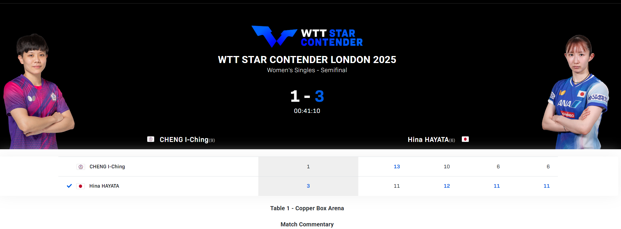 北京时间10月26日,WTT伦敦球星挑战赛女单半决赛上演了一场精彩对决。日本选手早田希娜在先失一局的情况下,以3-1的比分逆转战胜了中国台北33岁老将郑怡静,成功晋级决赛。四局比分分别为:11-13、12-10、11-6、11-6。由于另一场半决赛将在日本选手张本智和与桥本帆乃香之间进行,因此日本队已提前锁定了本次比赛的冠亚军。