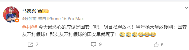 对于这场比赛,著名记者马德兴表达了极度的不满和愤怒。他直言不讳地表示:“今天最恶心的应该是国安了吧!当年杨大爷敢硬刚:国安从不打假球!那支从不打假球的国安早就死了!”马德兴的这番话,无疑是对北京国安当前表现的一种严厉批评。