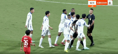 第77分钟,阮奇龙被铲倒,裁判判罚任意球。第89分钟,莱昂纳多-席尔瓦战术犯规拉拽刘欢,再次领到黄牌。比赛高潮出现在补时阶段:第90+8分钟,主裁判判罚石家庄功夫禁区内犯规并指向点球点,石家庄队员情绪激动围攻裁判,VAR介入后取消点球判罚,引发全场哗然。
