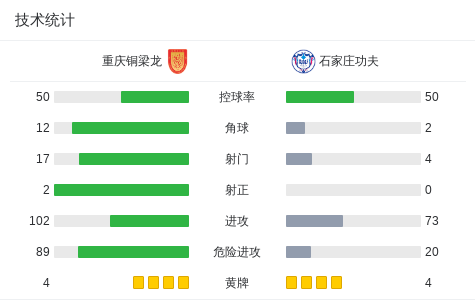 技术统计显示,双方控球率接近,但射门次数均未超过10次。重庆铜梁龙获得5次角球机会,石家庄功夫则有3次。全场最佳机会出现在第59分钟,莱昂纳多-席尔瓦的倒钩射门距离破门仅差毫厘。