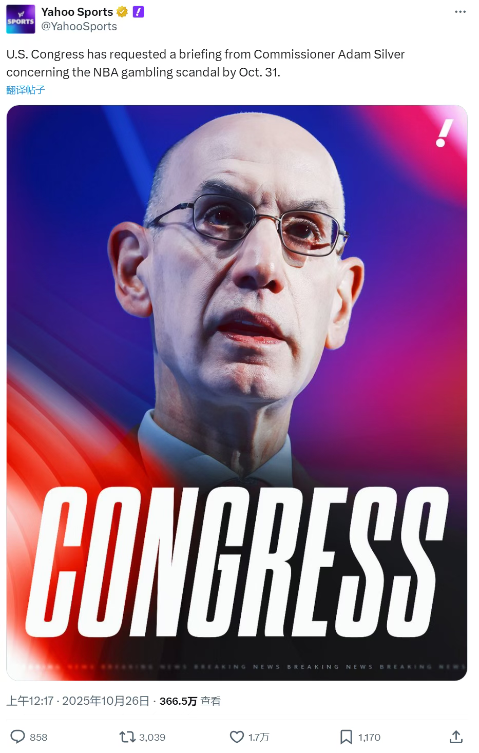 NBA赌球丑闻已从联盟内部风波升级为惊动美国国会的重大事件!据雅虎体育最新报道,美国众议院能源与商业委员会已正式介入调查,并向NBA总裁亚当·萧华发出最后通牒:要求其必须在10月31日前就系列赌博丑闻作出详细汇报。这一举动标志着,NBA赌球问题已从体育范畴上升至国家监管层面。