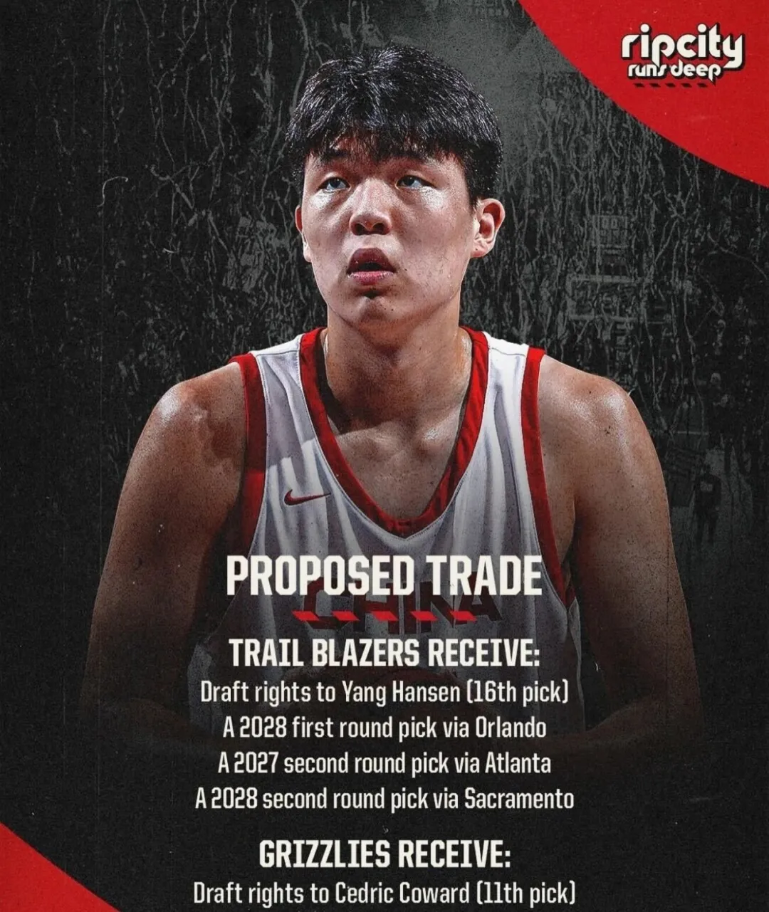 今年选秀大会上,灰熊为了从开拓者手里得到选中考沃德的11号签,不惜送出16号签(原属于杨瀚森)、一个未来首轮签以及两个次轮签。