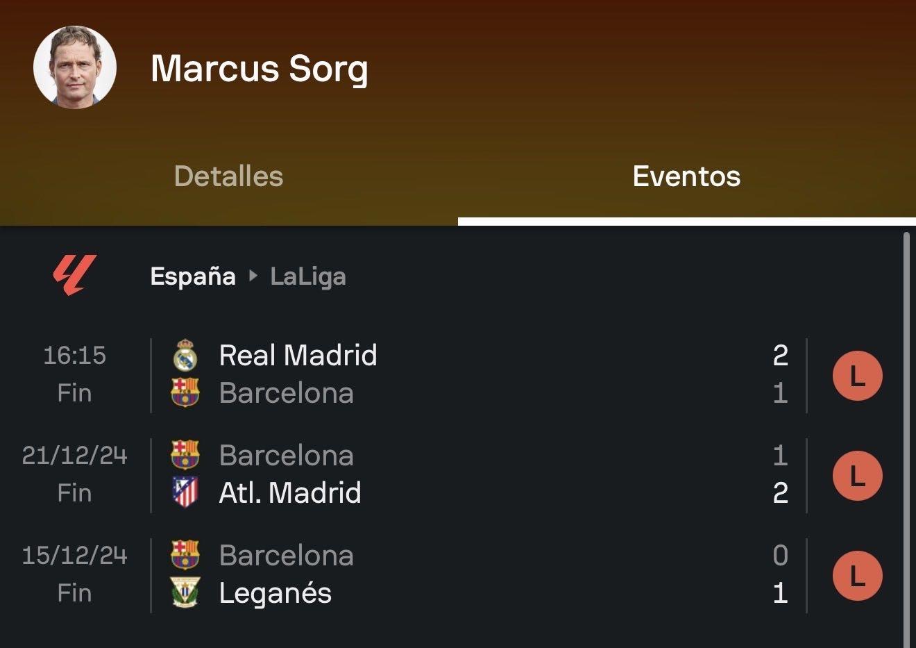 雷速体育10月27日讯,在刚刚结束的西甲第10轮国家德比中,巴萨客场1-2不敌皇马,这场失利不仅让巴萨在国家德比中败下阵来,更引发了外界对球队临场指挥的关注。据数据显示,本场比赛担任临场指挥的巴萨助教索尔格,在此前指挥的三场比赛中全部输球,球队战绩堪忧。