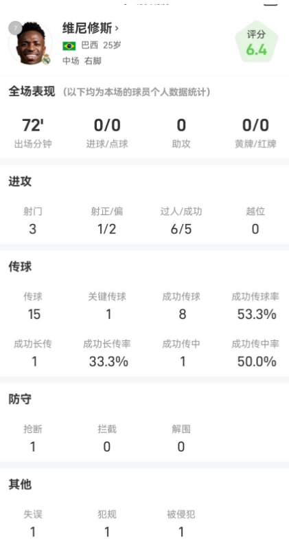 在传球方面,维尼修斯也有着不俗的表现。他全场共送出了15次传球,其中8次成功,包括1次关键传球,传球成功率为53.3%。此外,他还完成了1次成功长传,成功率为33.3%,以及1次成功传中,成功率为50%。这些数据都显示了维尼修斯在进攻组织中的重要作用。