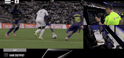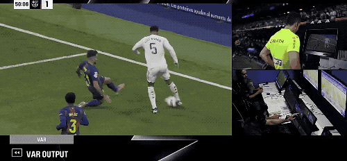 国家德比的戏剧性远不止于此。第12分钟,皇马前场抢断成功,姆巴佩出其不意地一脚世界波,打破了场上的僵局。然而,西甲半自动越位系统却启动了,慢镜头显示姆巴佩稍稍越位,进球因此无效。