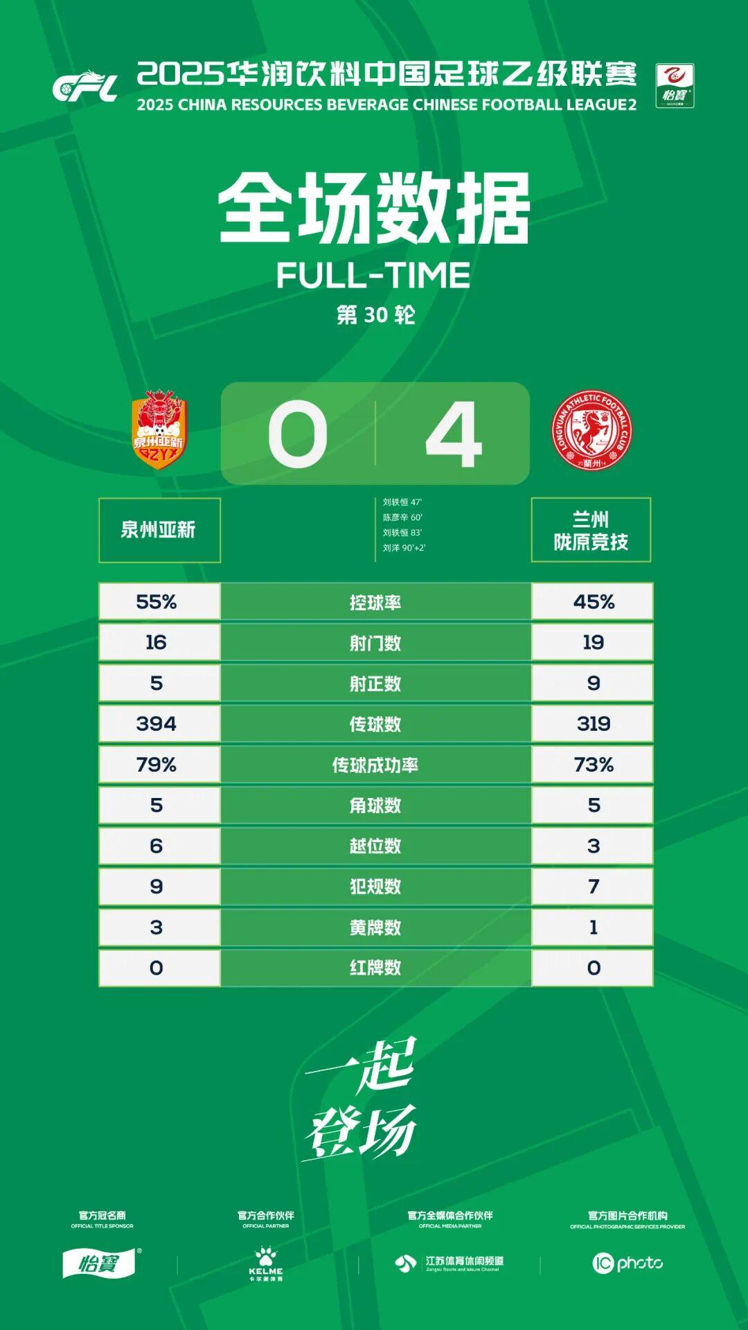 最终,全场比赛结束,泉州亚新0-4不敌兰州陇原竞技。