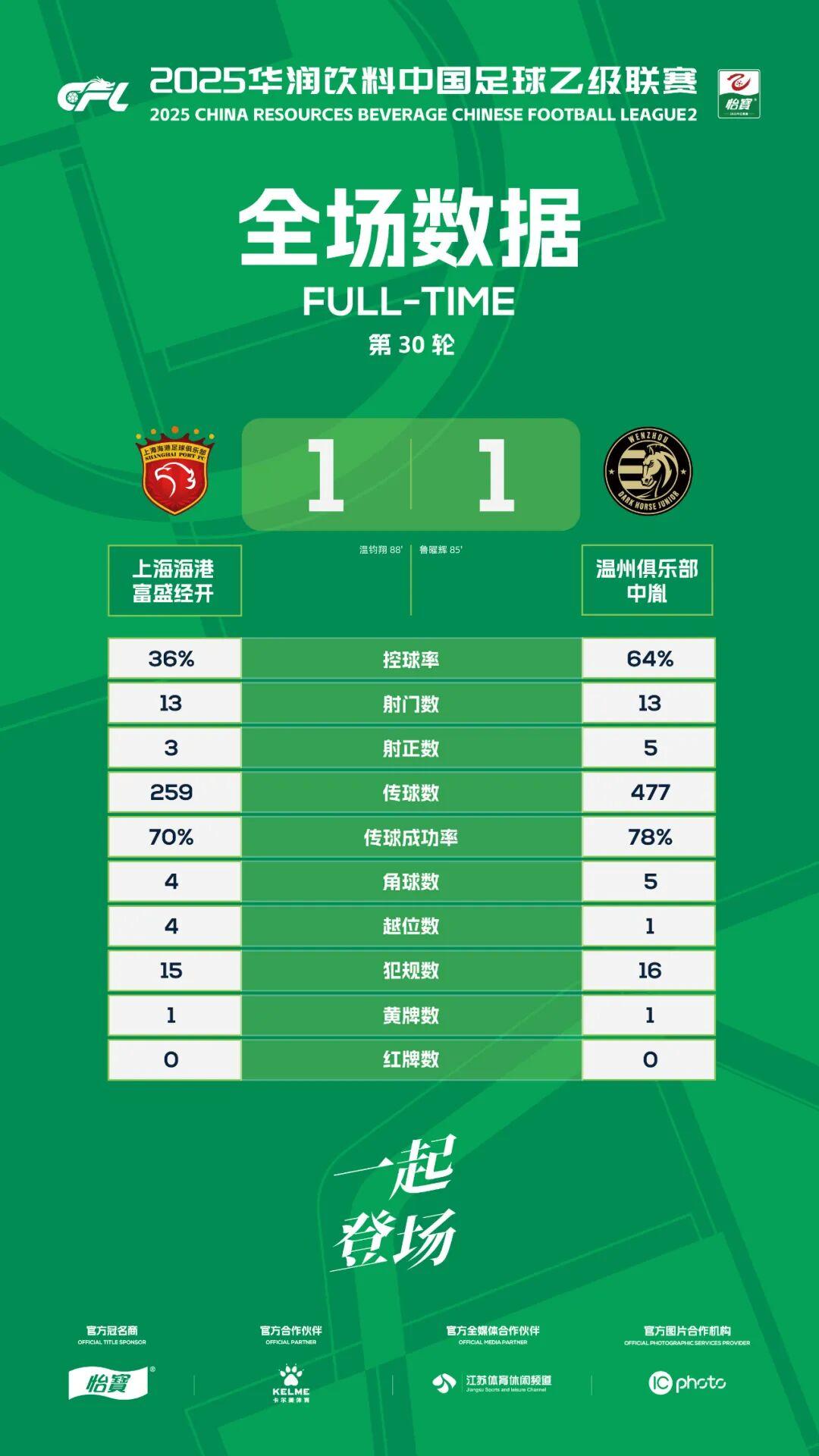 最终,全场比赛结束,上海海港富盛经开1-1战平温州俱乐部中胤。
