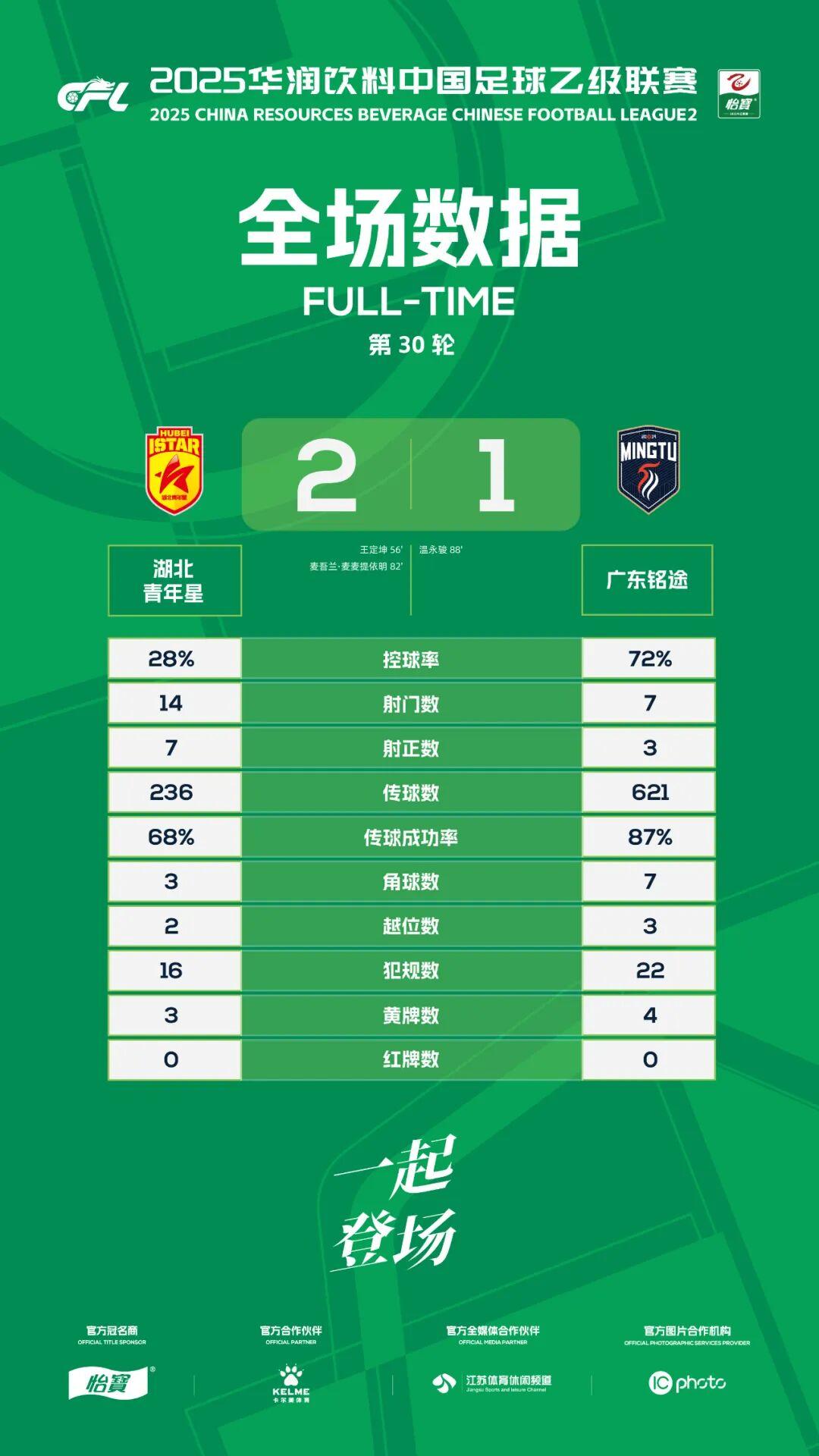 10月25日14:30,2025华润饮料中乙联赛第30轮第一比赛日,湖北青年星对阵广东铭途的比赛在湖北足管中心训练基地中心球场进行。湖北青年星的王定坤、麦吾兰·麦麦提依明各入一球,广东铭途的温永骏破门。最终,湖北青年星2-1战胜广东铭途。