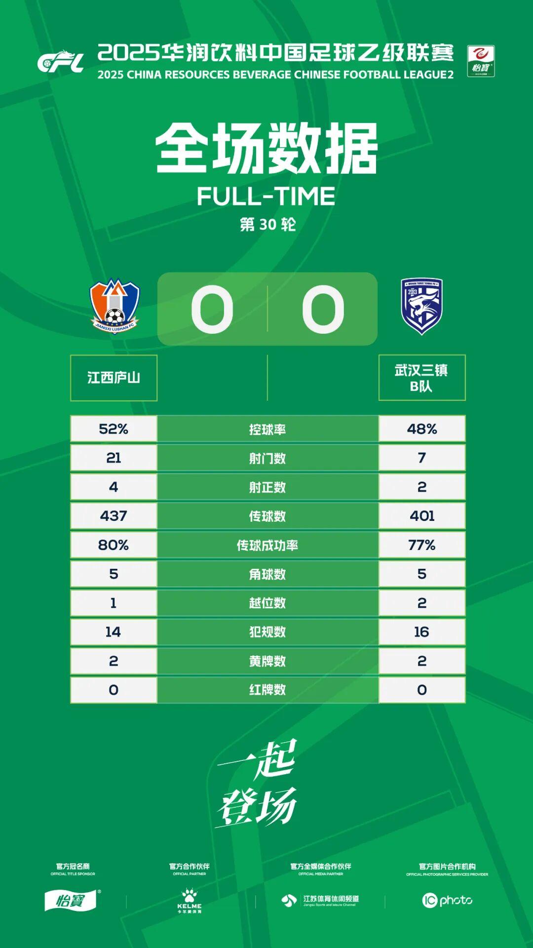 最终,全场比赛结束,江西庐山0-0战平武汉三镇B队。