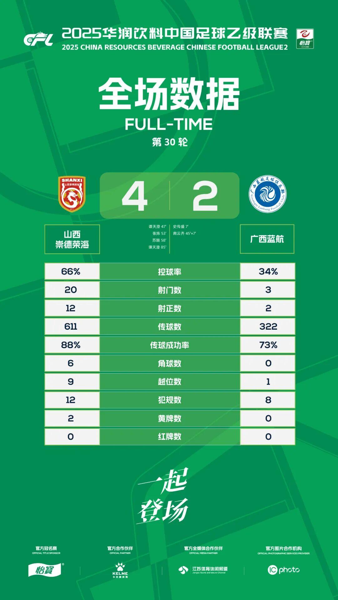 10月25日14:30,2025华润饮料中乙联赛第30轮第一比赛日,山西崇德荣海对阵广西蓝航的比赛在太原学院足球场进行。山西崇德荣海的谭天澄上演梅开二度,张炜、苏顺各入一球,广西蓝航的史传盛、南云齐破门。最终,山西崇德荣海4-2战胜广西蓝航。