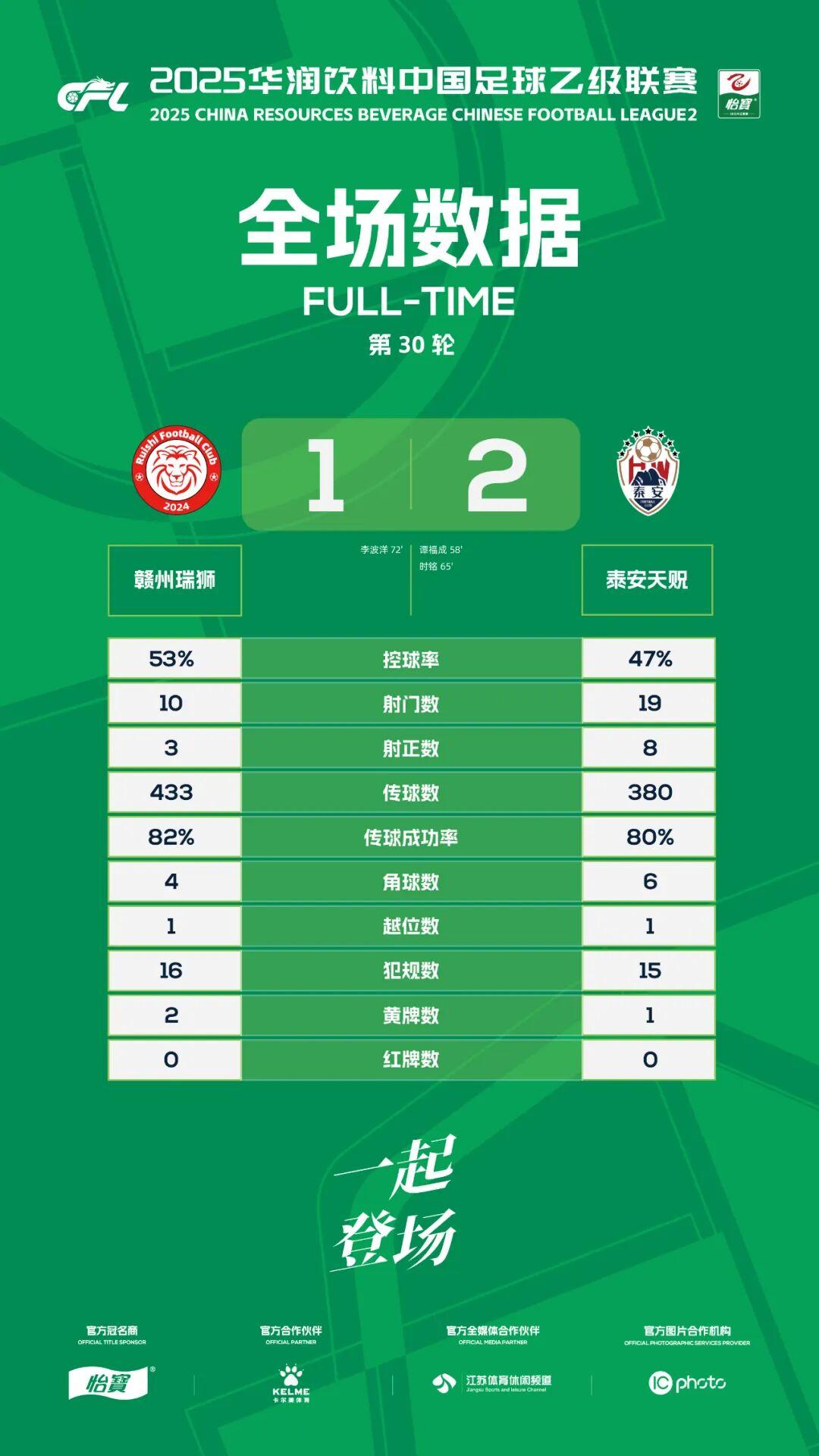 最终,全场比赛结束,赣州瑞狮1-2不敌泰安天贶。