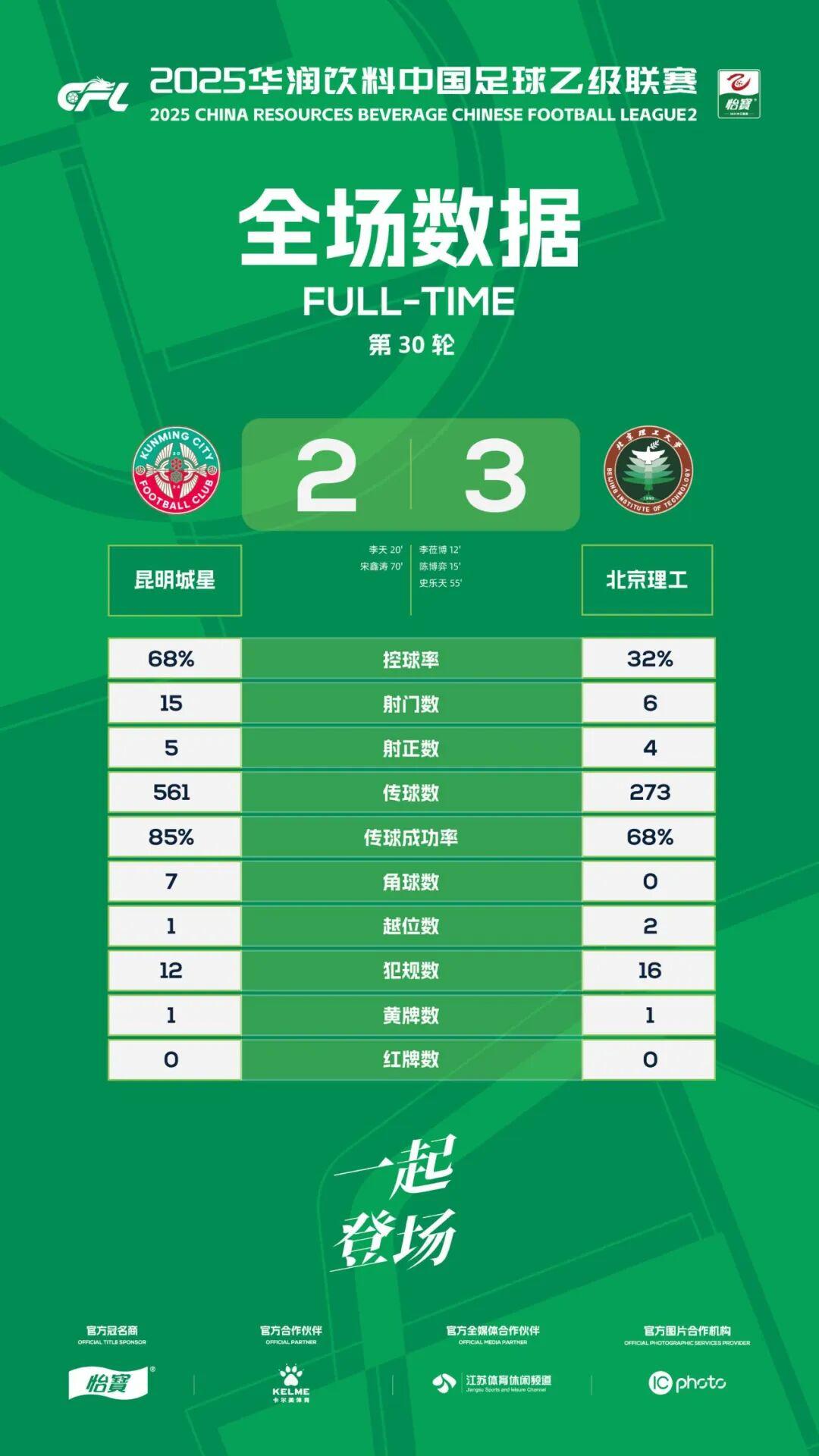 10月25日14:30,2025华润饮料中乙联赛第30轮第一比赛日,昆明城星对阵北京理工的比赛在云南科化足球训练基地进行。昆明城星的李天、宋鑫涛破门,北京理工的李莅博、陈博弈、史乐天各入一球。最终,昆明城星2-3不敌北京理工。