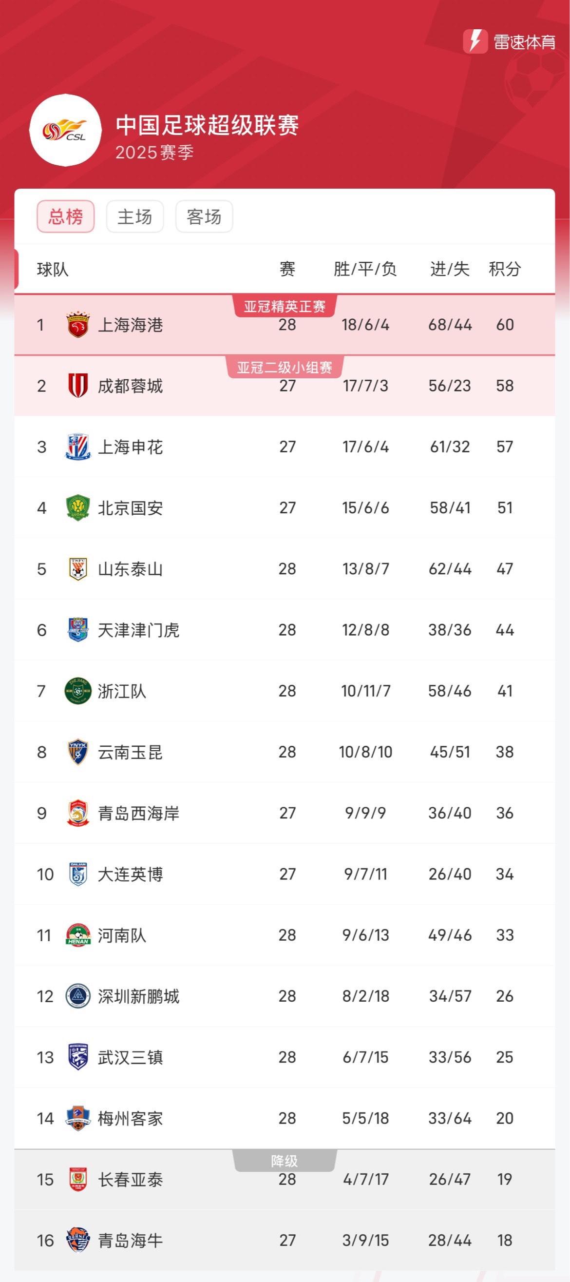 根据最新积分榜数据,上海海港目前以59分暂列榜首,但仅领先排名第二的成都蓉城2分。这意味着,若成都蓉城在今晚的比赛中战胜青岛西海岸,将凭借净胜球优势反超登顶。另一支争冠热门球队上海申花,本轮将迎战大连英博,目前以57分位列第三,仍保留着冲击榜首的希望。