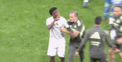 终场哨响后,冲突进一步升级。亚马尔对着皇马球员放话:“有种就出去干架!”这句话彻底点燃了维尼修斯的怒火。巴西边锋挣脱工作人员阻拦,直冲亚马尔而去,最终被五六名安保人员合力抱住才避免事态扩大。