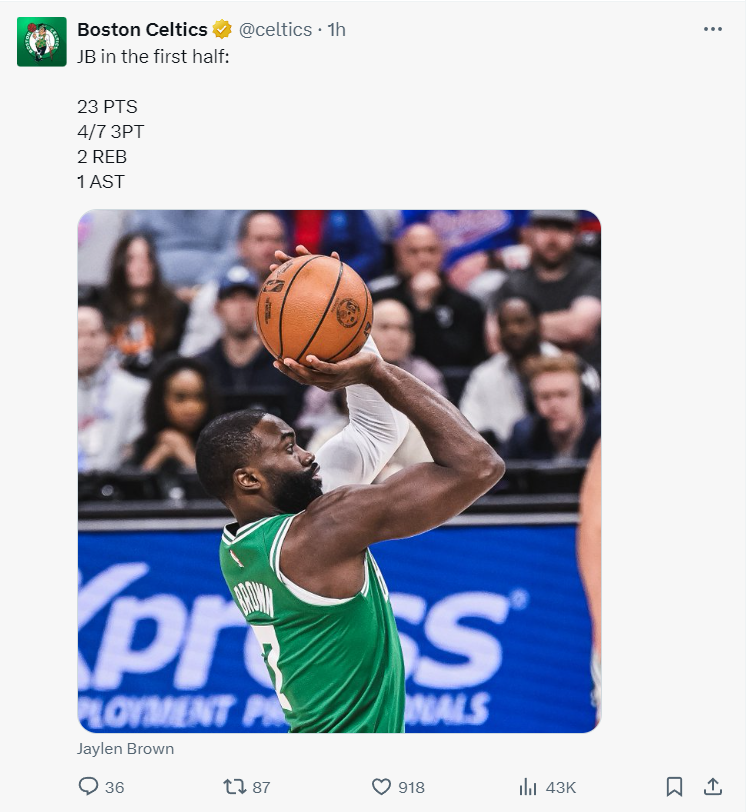 比赛伊始,杰伦·布朗便展现出极佳的手感,开场5分钟内5投4中,三分球2中2,轻松砍下10分。若不是早早领到2次犯规,凯尔特人队在首节的领先优势或许会更加明显。上半场,布朗在15分钟内13投7中,三分球7中4,贡献23分2篮板1助攻,个人发挥堪称完美。