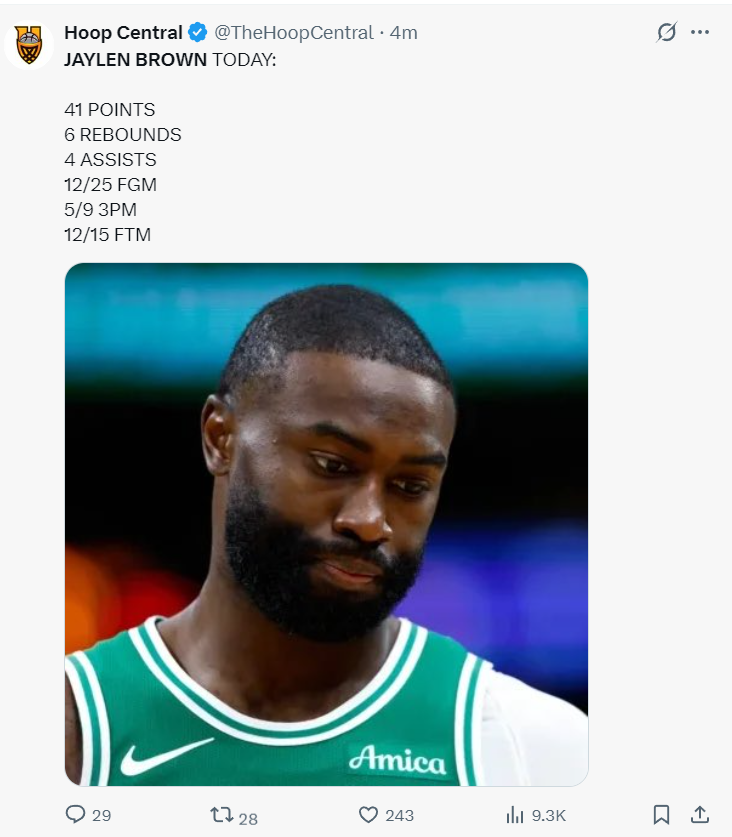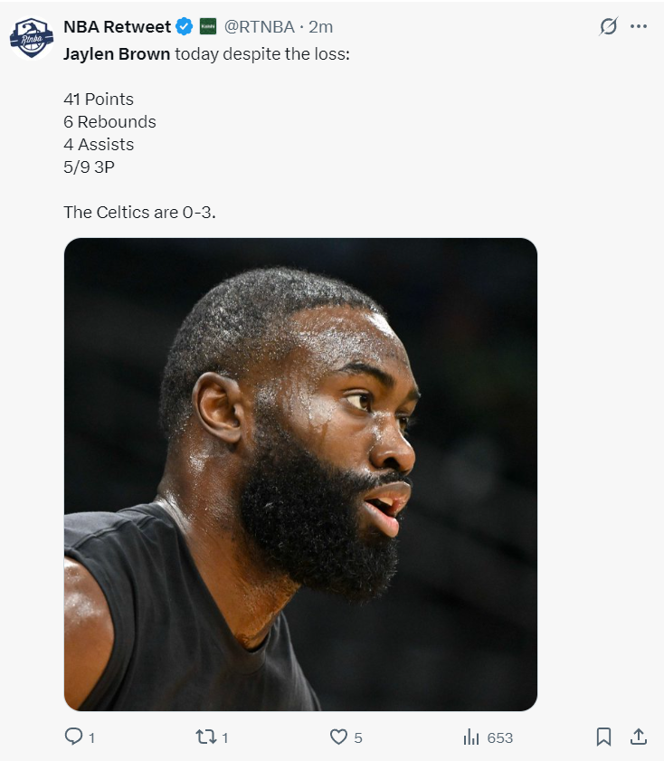 值得一提的是,布朗开赛季的三场比赛都拿到了20+的得分,首战23分,次战25分,这场比赛更是砍下41分。然而,尽管布朗表现出色,但凯尔特人队就是无法拿到胜利。这也让球迷们对凯尔特人队的未来充满了担忧。