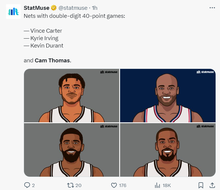 值得一提的是,这场比赛托马斯再度创造了多项纪录。他完成了生涯第十次40+的壮举,这一数字追平了篮网名宿杜兰特。在篮网队史上,托马斯的10次40+仅次于卡特的17场和欧文的14场。此外,托马斯还是2006年以来首位在一场比赛中得到40+分且助攻为0的篮网球员,这一纪录无疑将载入史册。