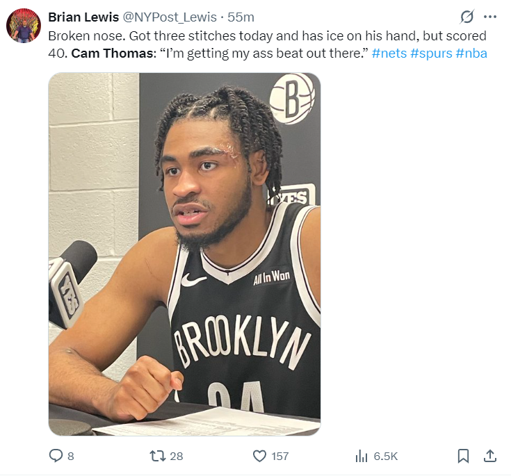 赛后,托马斯谈到了自己的伤势。他表示鼻子被打了一下,眉骨缝了三针,手部还在冰敷。他幽默地说:“这场比赛我被马刺球员们打惨了。”尽管受伤,但托马斯依然保持着乐观的心态。