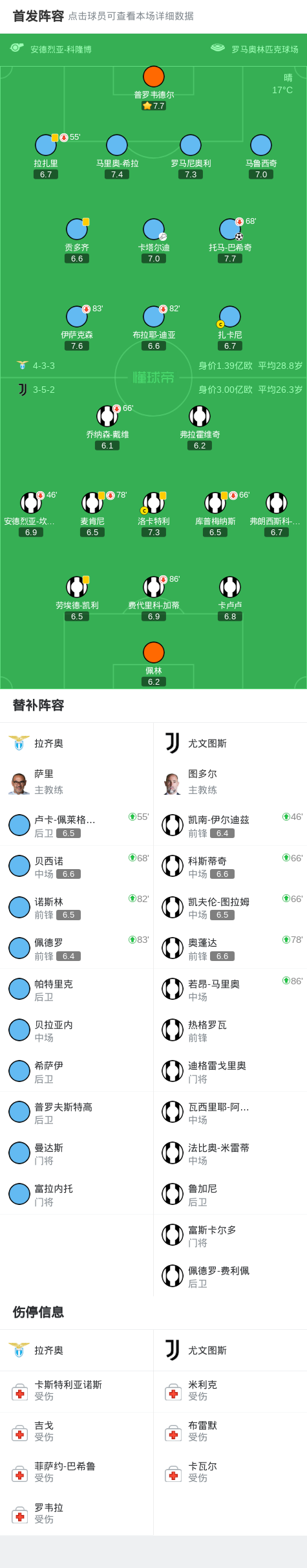 全场比赛拉齐奥控球率达到58%,完成12次射门其中4次射正;尤文图斯虽有14次射门,但仅3次命中目标。角球次数方面,拉齐奥以7-4领先。