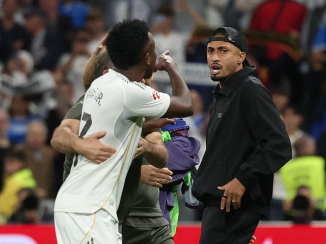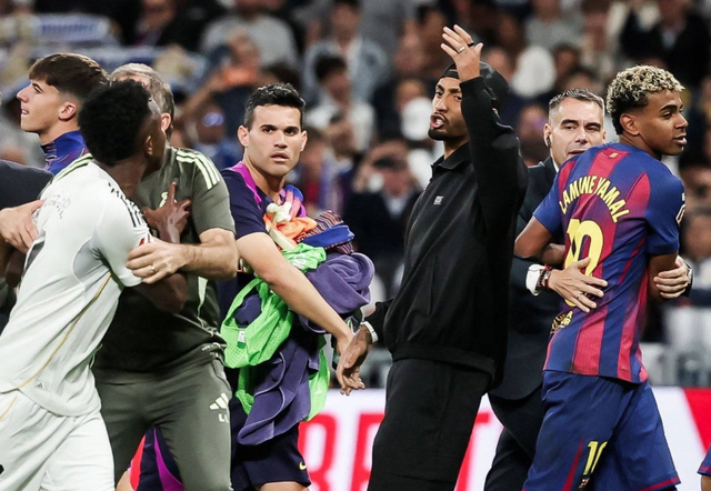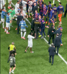 双方的焦点迅速集中到维尼修斯与亚马尔的对峙上。多名皇马工作人员试图拦住维尼修斯,而拉菲尼亚(反戴鸭舌帽)也迅速冲到第一现场,成功拦住了维尼修斯和亚马尔,避免了冲突的进一步升级。