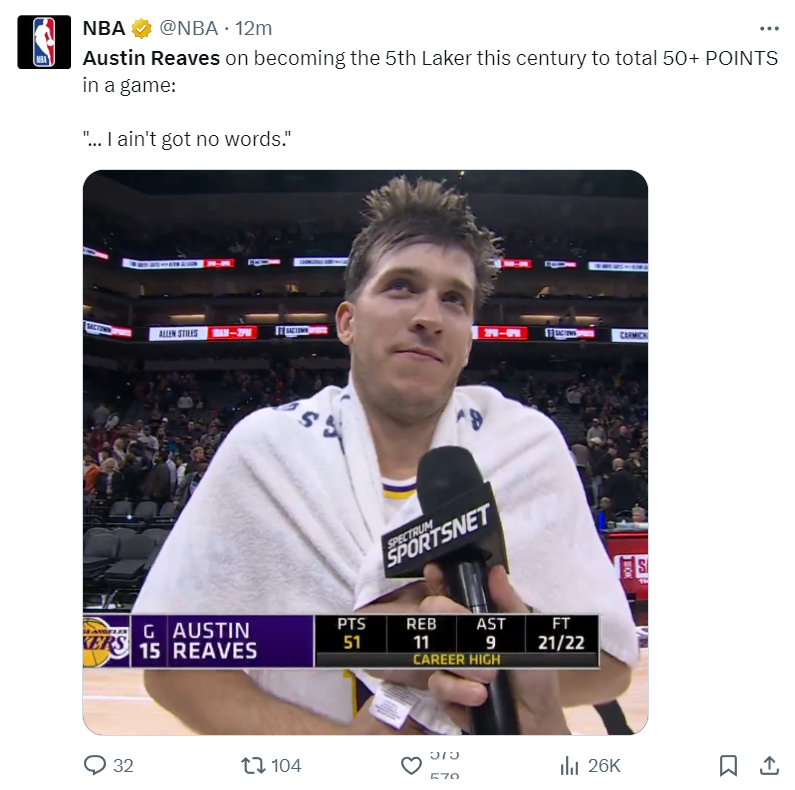 除了51分的生涯新高之外,里夫斯在这场比赛中还创造了多项纪录。他单场罚球22次、命中21次,均创下了生涯新高;同时,他还完成了生涯第500个三分里程碑。在湖人队史中,里夫斯也留下了浓墨重彩的一笔。他成为了湖人队史第12位单场50+的先生、本世纪第五位拿到50+的湖人球员、湖人队史第八位单场50+10篮板的球员,以及单场50+10+5湖人队史2010年科比后的首人。
