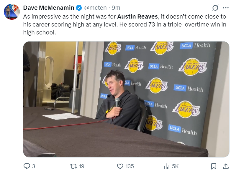 赛后,当被问及自己的50分表现时,里夫斯显得有些羞涩和谦逊。他表示:“啊,啊,我不知道该怎么表达。”然而,在接受湖人媒体采访时,他却以一种幽默的方式回应了这一成就:“嗯,这个夜晚的确非常精彩,但这跟我其他级别比赛创造的高分简直不值一提,我曾在高中的一场三加时的比赛中拿到过73分。”里夫斯的这番话,不仅展现了他的幽默感,更体现了他对篮球的热爱和追求。