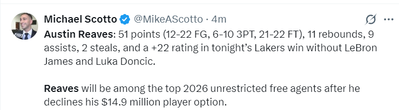 在一场焦点对决中,湖人队后卫奥斯汀·里夫斯以惊世骇俗的表现震撼了整个NBA联盟。面对国王队的挑战,里夫斯全场出战39分钟,以22投12中、三分10中6、罚球22中21的超高效率,狂砍51分11篮板9助攻2抢断的全面数据,不仅刷新了个人职业生涯得分纪录,更成为湖人队史第12位单场50+的传奇球员。