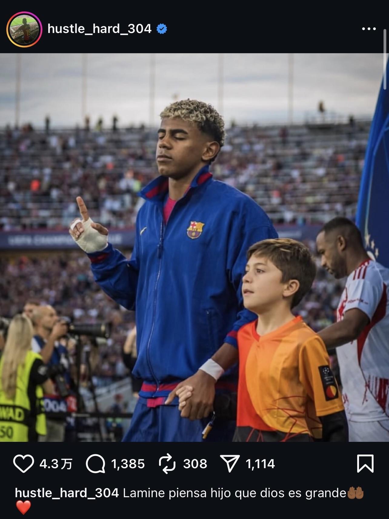 紧接着,亚马尔的父亲又发了第二条帖子:“拉明,想想吧,孩子,上帝是伟大的。❤️”这句话充满了对儿子的鼓励与教诲,似乎在提醒亚马尔要时刻保持谦逊与敬畏之心,同时也不忘表达对上帝的信仰与感激。