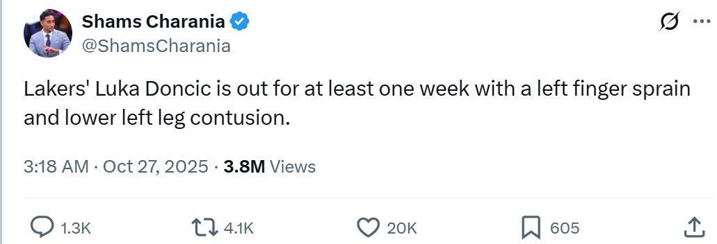 在对阵森林狼队爆砍49分11篮板8助攻率队取胜后,ESPN名记Shams曝出湖人后场核心东契奇遭遇左手指扭伤与左小腿挫伤,预计将缺席一周时间。湖人队官方迅速确认消息真实性,东契奇也缺席了球队对阵开拓者队的比赛。