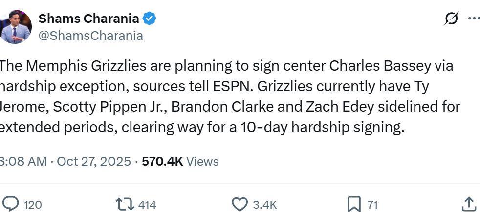 另外一支西部球队灰熊的状况则更为夸张,小皮蓬、克拉克、扎克伊迪与新援杰罗姆都确认将长期缺席。这导致灰熊队不得不向联盟申请10天伤病特例,以签下查尔斯-巴西应对内线捉襟见肘的人员轮转空缺。