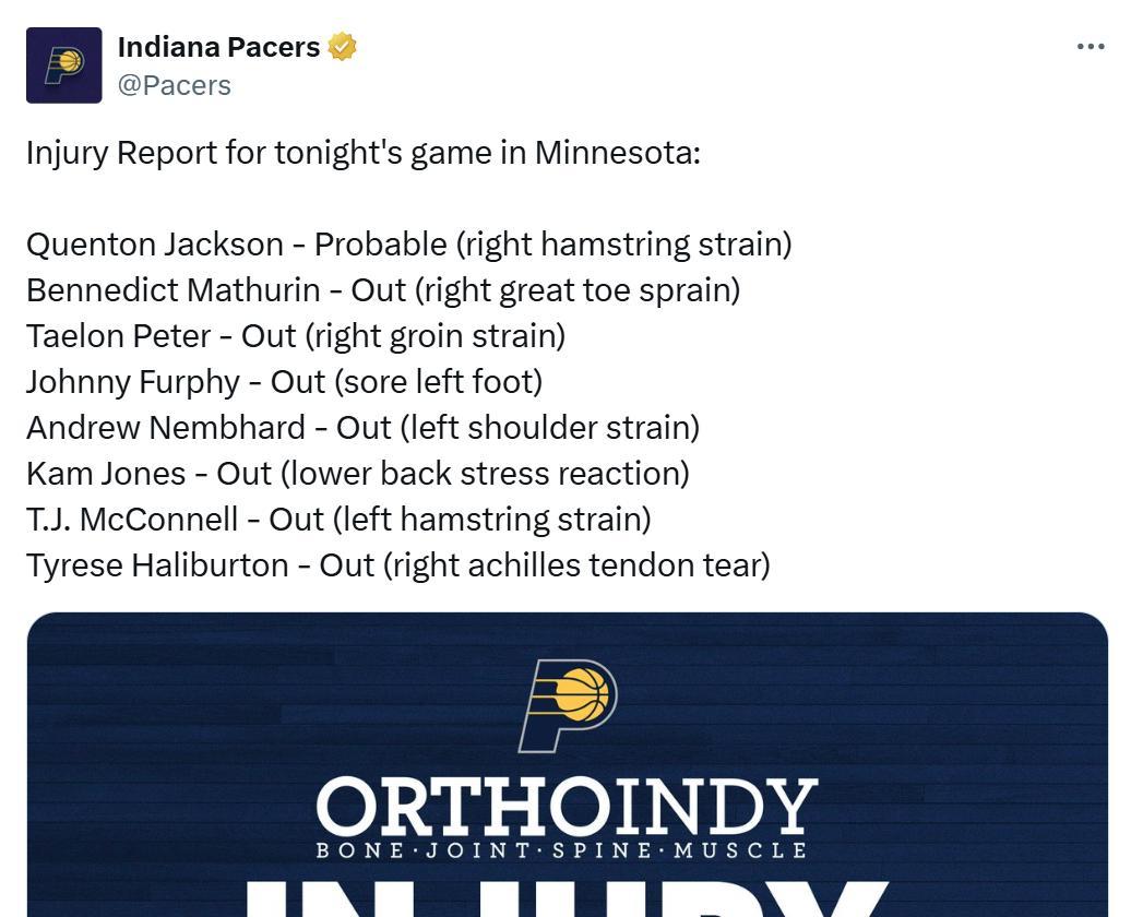 这样的状况也并非竞争激烈的西部特有,在对阵森林狼的比赛中,步行者队更是一口气7人缺阵,其中包括哈利伯顿、内姆哈德、马瑟林与麦康奈尔等诸多核心轮转球员。