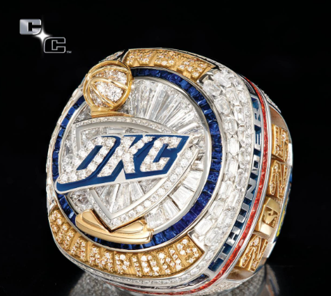 戒指的左右侧分别刻有“Oklahoma City”、“球员姓名”、“68胜14负的常规赛战绩”、“钻石排成的球衣号码”,以及“Thunder”、“雷霆Logo”、“2025”等字样(0的中空部分由NBA Logo代替)。这些元素主要以14K白金、球队代表色的蓝色和橙色蓝宝石以及钻石组成,色彩斑斓,美不胜收。