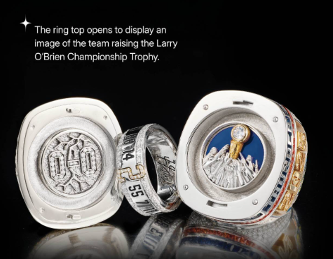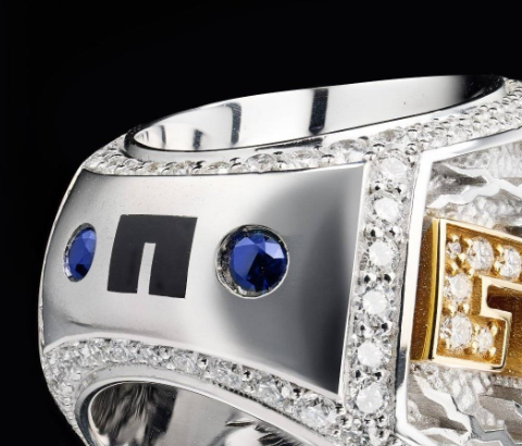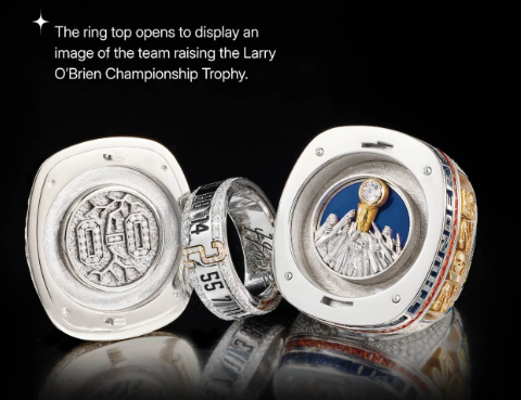 2025年的总冠军戒指,每一枚都镶嵌着超过800颗手工精心镶嵌的宝石,尽显奢华与精致。戒指顶部主要由14K金打造,上面镶嵌着一百颗璀璨钻石,并刻有“NBA CHAMPIONS”的字样,彰显着冠军的尊贵身份。而更为突破性的创新设计在于,每个戒指顶部都可以像盖子一样拆卸,打开后竟然藏着另一个小型戒指,形成了一个环中环的巧妙结构,令人叹为观止。