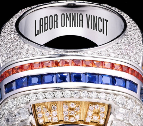 戒指外侧掌心处,刻有致敬俄克拉荷马国家纪念碑的时光之门和倒影池图案。14K白金打造的时光之门造型刻在一对圆形蓝宝石之间,意在呼应波光粼粼的水面,寓意着时间的流逝与荣耀的永恒。内侧手掌侧则刻有拉丁文“labor omnia vincit”,这是俄克拉荷马的格言,意为“劳动可以征服一切”,激励着球员们不断努力,追求更高的成就。