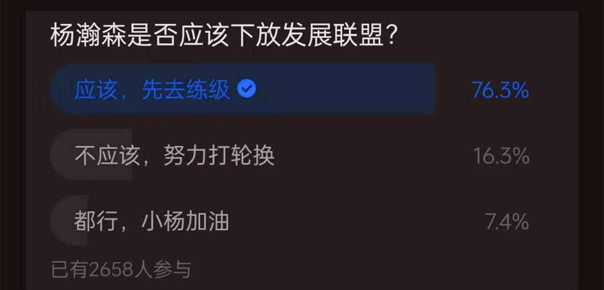 不仅是媒体人对于杨瀚森的评价出现争议,有关他是否要去G联盟练级也成为外界热议焦点。针对这一话题,超千人票选给出答案,结果超过7成的球迷认为杨瀚森应当去G联赛练级。