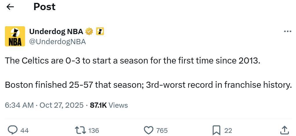 在连续不敌76人与尼克斯后,凯尔特人第三战面对东部劲旅活塞时,一度建立起17分的领先优势。然而,球队在末节突然崩盘,最终以113-119被逆转。这场失利让凯尔特人成为自2012年以来,首支开季遭遇三连败的球队。上一次出现如此窘境时,球队当季仅取得25胜57负的惨淡战绩,无缘季后赛。