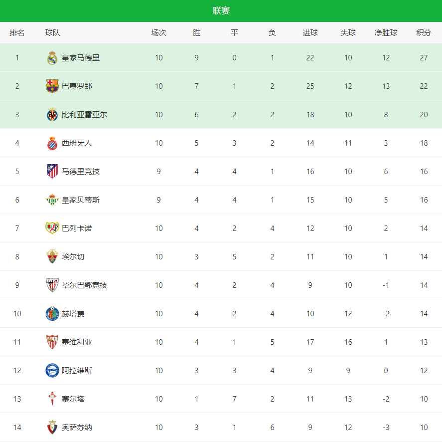 下半场,巴萨全力反扑,但姆巴佩错失点球,佩德里染红离场。最终,皇马主场2-1力克巴萨,终结国家德比4连败的耻辱。积分榜上,皇马积27分领跑西甲,领先巴萨5分稳居榜首,马竞则掉队。