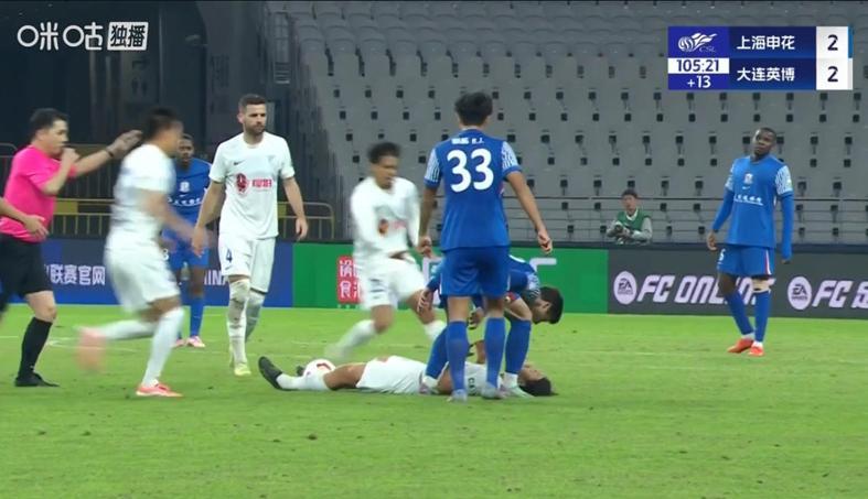 下半场比赛进入白热化阶段,拼抢和对抗明显加强。补时阶段第90+10分钟,毕津浩和吴曦在禁区内争顶高空球时,后者面部受伤倒地。经过var介入,裁判判罚点球,路易斯一蹴而就将比分扳为2-2。原本补时13分钟已是超长补时,但主裁判认为双方冲突占用了时间,因此决定继续补时。