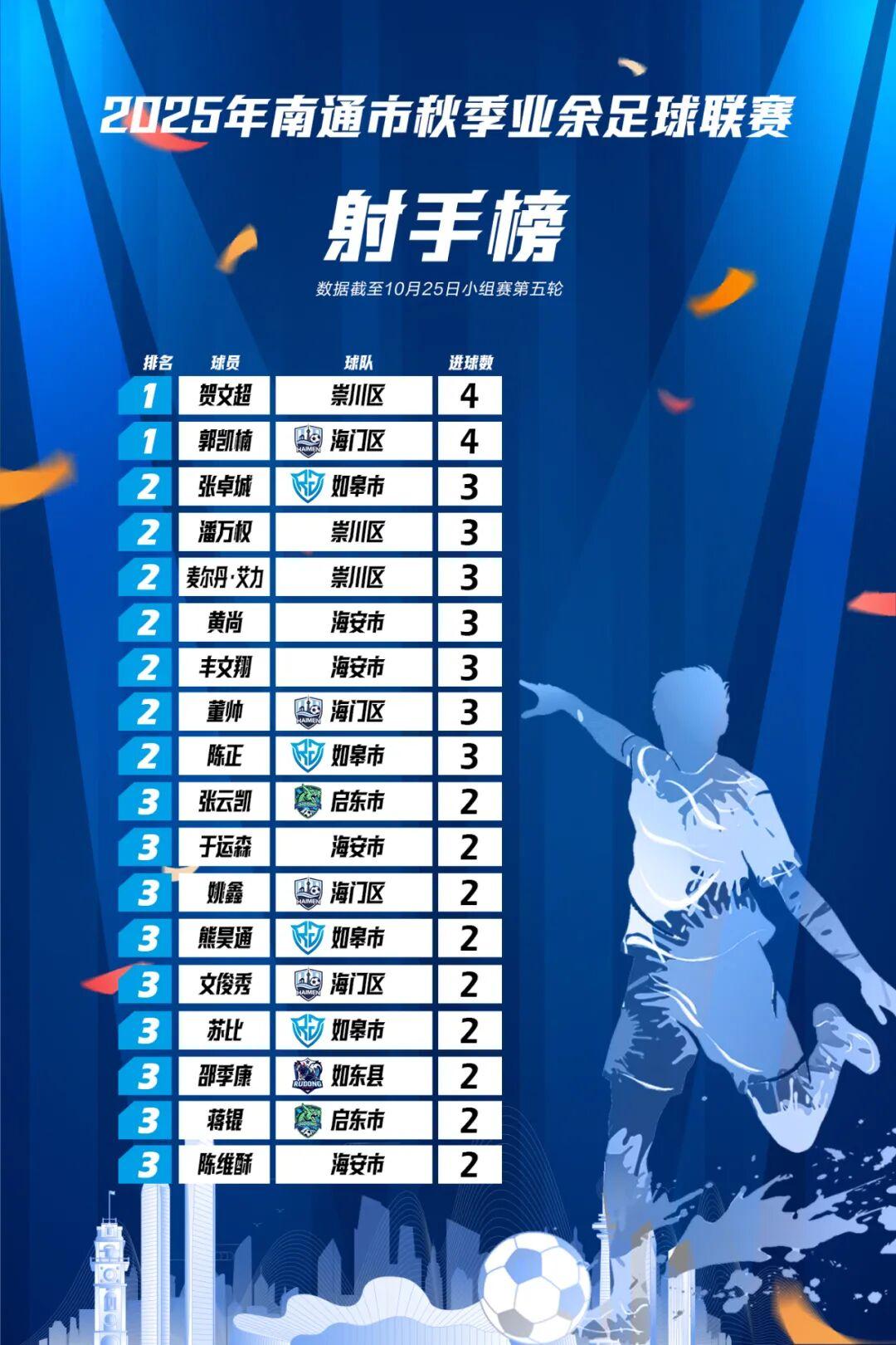 在刚刚结束的2025年南通市秋季业余足球联赛小组赛阶段,如皋市代表队以绝对优势登顶小组积分榜,成为首阶段最大赢家。与此同时,射手榜竞争进入白热化,贺文超、郭凯楠两位锋线杀手以8粒进球并列榜首,引领南通业余足球的进攻风暴。