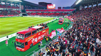 在一阵阵“辽宁冲超”的欢呼声中,搭载着辽宁铁人队将士的花车在铁西体育场内绕场一周,将辽沈足球胜利的欢庆氛围推向高潮。