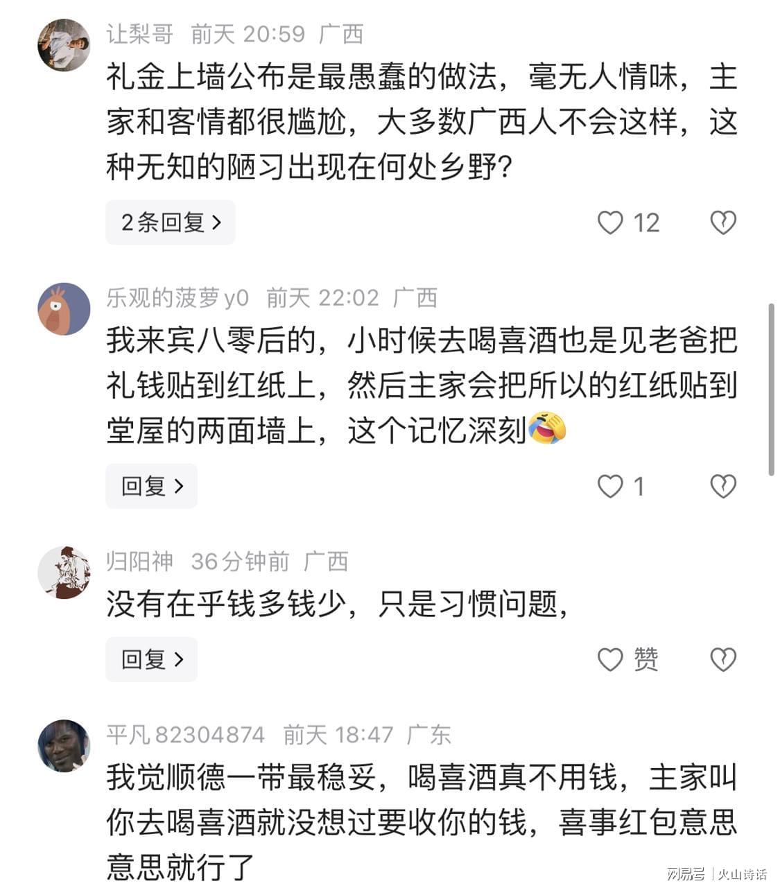对于这一做法,网友们的看法褒贬不一。有网友直言不讳地表示:“礼金上墙公布是最愚蠢的做法,毫无人情味,主家和客情都很尴尬。大多数广西人不会这样,这种无知的陋习出现在何处乡野?”