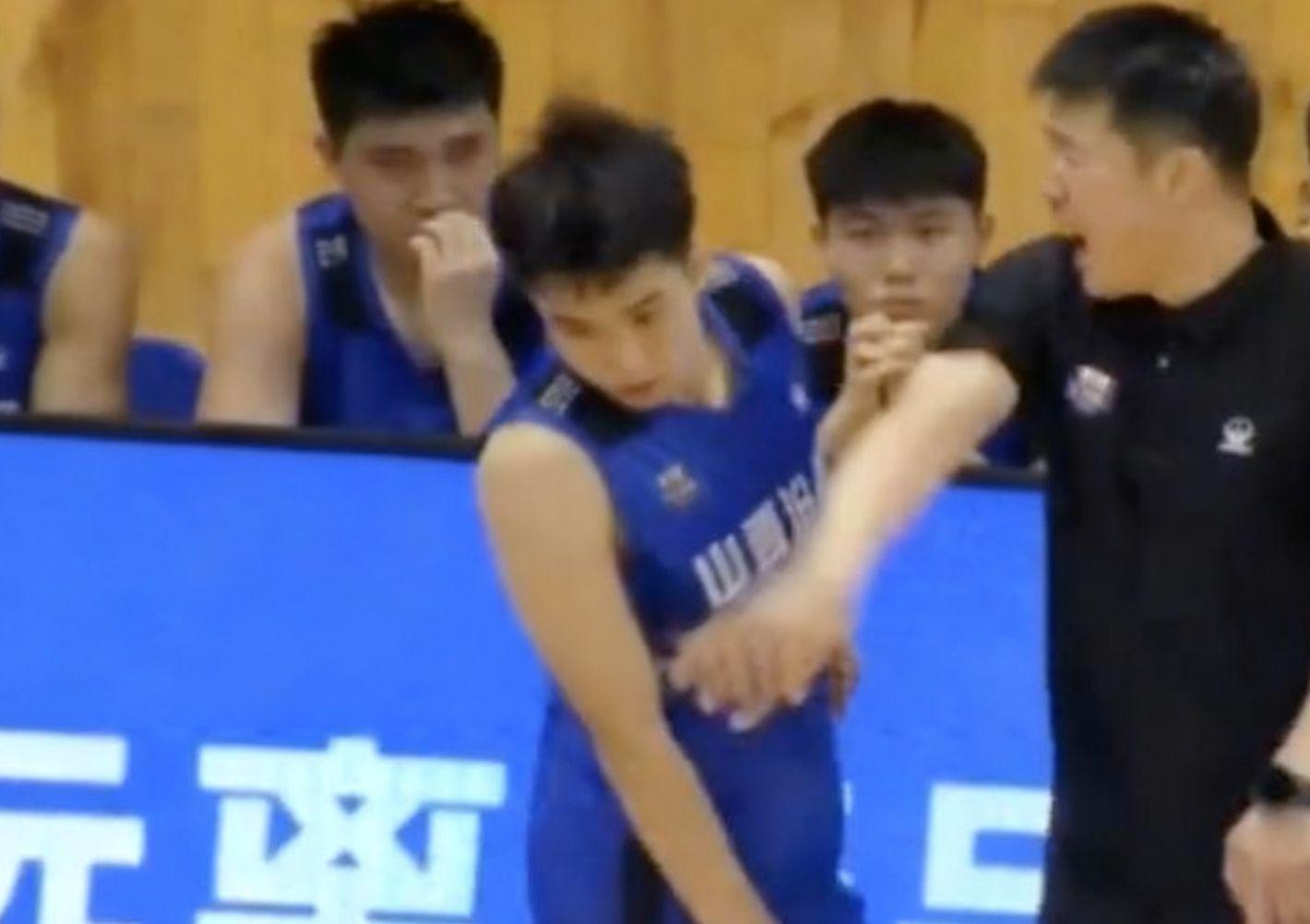 此时,山西队主教练王锡东显得十分着急,他将3号球员叫到场边,嘴里不停地说着什么,情绪似乎有些激动。随后,令人震惊的一幕发生了,王锡东疑似扇了小球员一个耳光,不过从现场情况来看,力量并不算大。