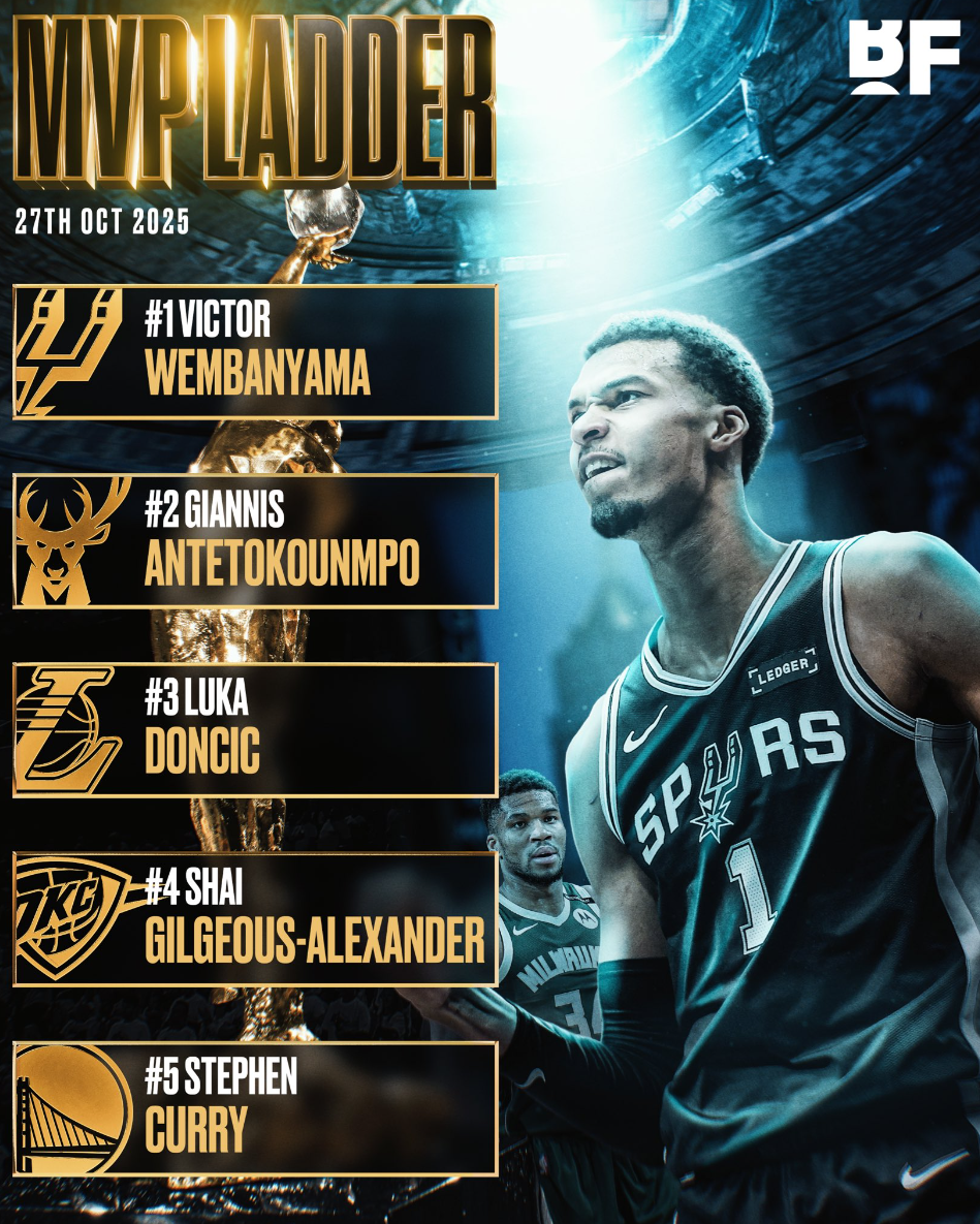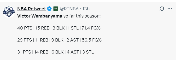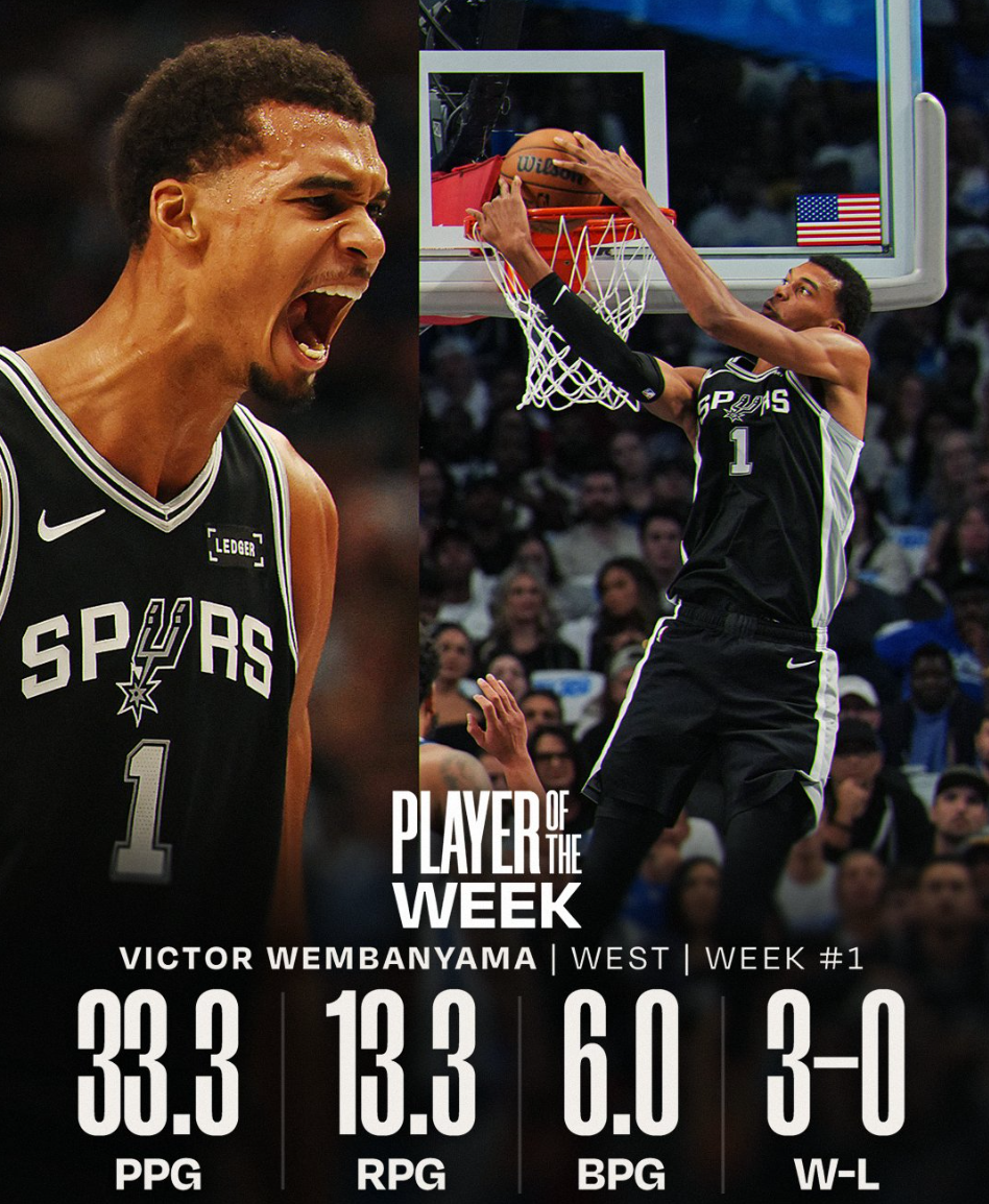 在此役之前,文班亚马刚当选西部周最佳球员。上周他场均贡献33.3分13.3篮板6盖帽,带领马刺取得3胜0负的战绩。同期东部周最佳由扬尼斯·阿德托昆博获得,两位欧洲超级新星正以不同方式统治联盟——而文班亚马仅是进入NBA的第三个赛季。