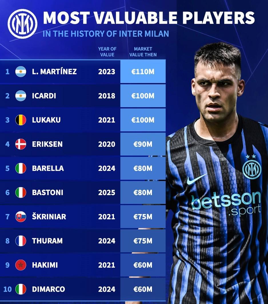 北京时间10月28日,德国转会市场(德转)公布了国际米兰队史球员身价排名前十的统计数据。其中,阿根廷前锋劳塔罗、前队长伊卡尔迪以及比利时中锋卢卡库均以至少1亿欧元的身价跻身前三,成为蓝黑军团历史上身价最高的三位球员。