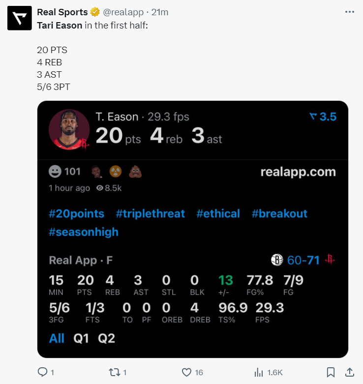 半场结束时,伊森仅登场14分33秒,就9投7中,其中三分6中5,罚球3中1,高效拿下20分4篮板3助攻,命中率高达77.8%,三分命中率更是达到了惊人的83.3%,真实命中率更是高达96.3%。伊森在场时,火箭队净胜对手13分,他的3D属性再次得到了充分展现。